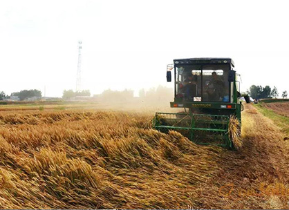 拖拉機和收割機在農(nóng)場收大米